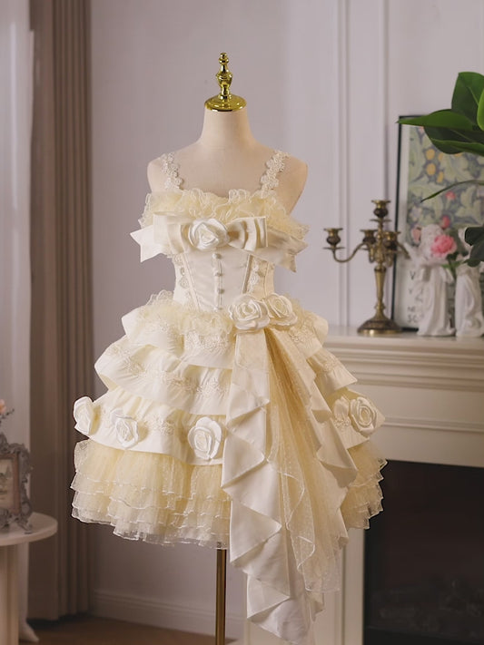 Vestido de fiesta corto de encaje sin tirantes con volantes color champán hc467