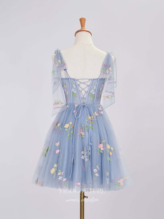 Vestido de regreso a casa con tirantes finos en azul escalonado y apliques de encaje hc407