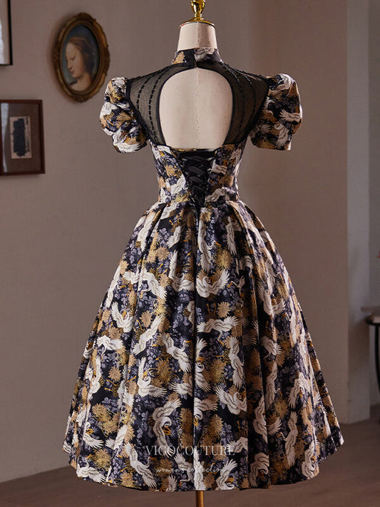 Elegante vestido de fiesta corto de satén jacquard Hoco 2024 con mangas abullonadas y cuello alto hc345
