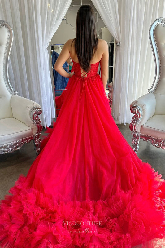 Vestidos de fiesta rojos sin tirantes con volantes 2024 con corpiño de encaje con cuentas 24233