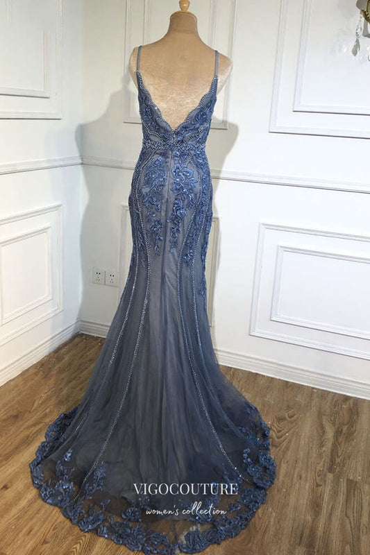 Vestido de fiesta de sirena con cuentas azules, tirantes finos y escote en V, 21614