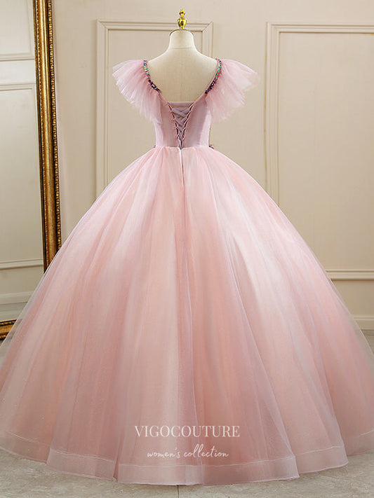 Vestidos de quinceañera con apliques de encaje ruborizado y tul brillante, vestidos de quinceañera 21423