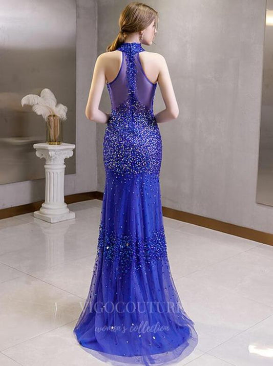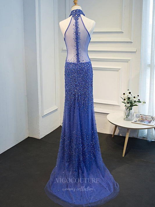 Vestido de fiesta azul de sirena con cuello halter y cuentas 20267