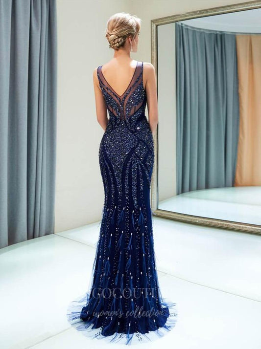Vestido de fiesta de sirena con cuentas azules, tirantes finos y escote en V, 21614
