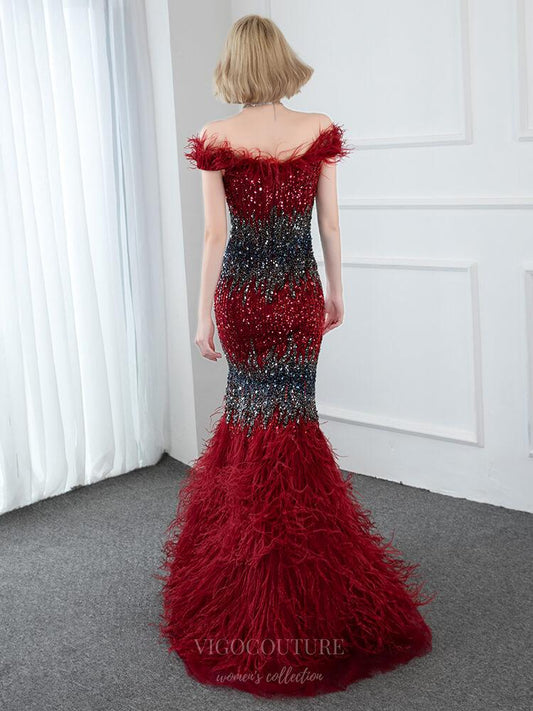 Vestido de fiesta de sirena con cuentas y encaje de plumas color burdeos 20786