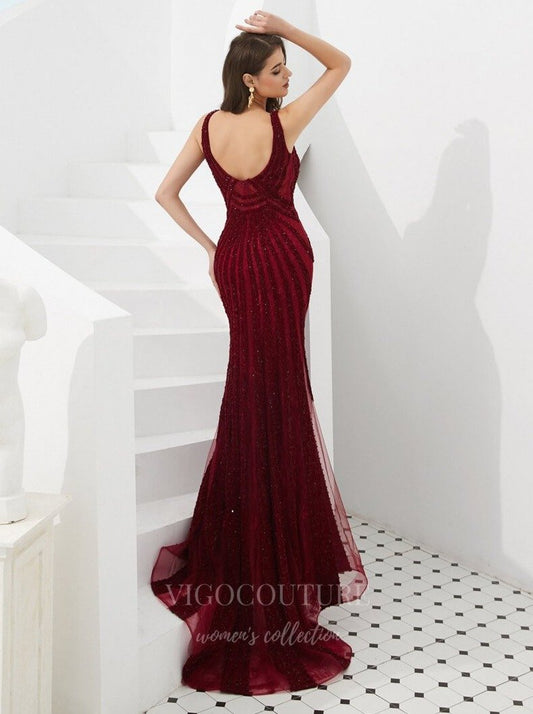 Vestido de fiesta de sirena burdeos con cuentas 20280