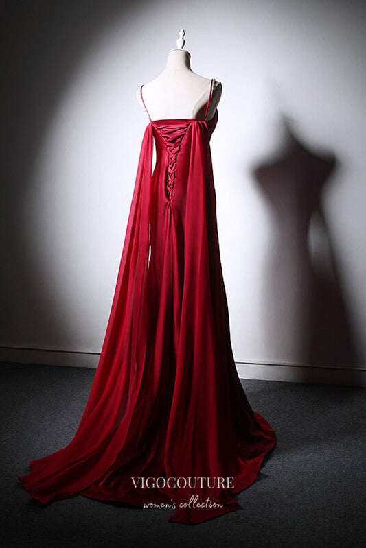 Vestido de fiesta de sirena en satén burdeos con tirantes finos y un escote en V espectacular 22233