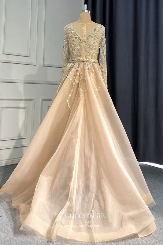 Vestido de fiesta de los años 20 con cuentas color champán, vestido de noche de manga larga 22137