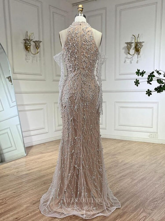 Vestido de fiesta de sirena con lentejuelas color marfil, cuello vuelto, tirantes finos y abertura en la espalda tipo corsé 24101