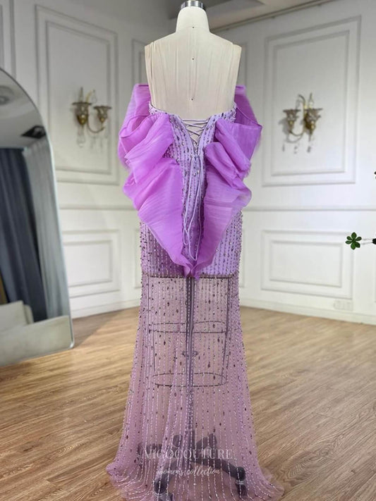 Vestido de fiesta transparente con cuentas lilas y hombros descubiertos 25009