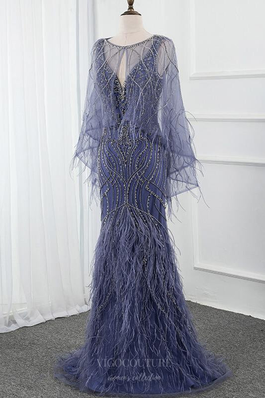 Vestido de fiesta de sirena con chal extraíble, plumas, encaje y cuentas 20792