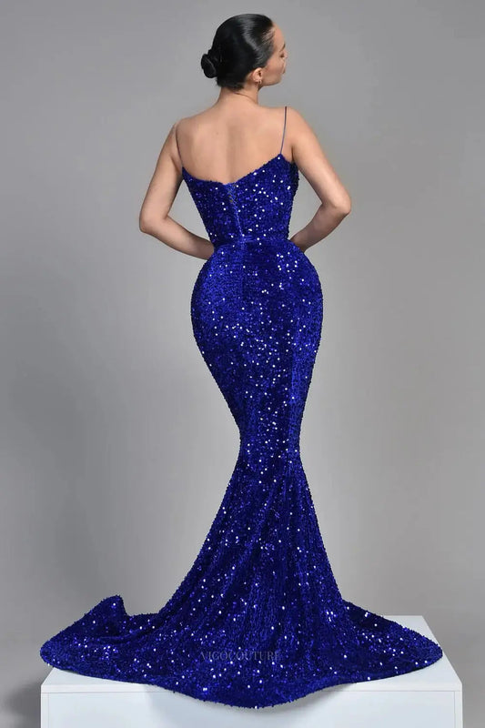 Vestido de fiesta de sirena con lentejuelas azul rey, tirantes finos y escote en V pronunciado - 22228