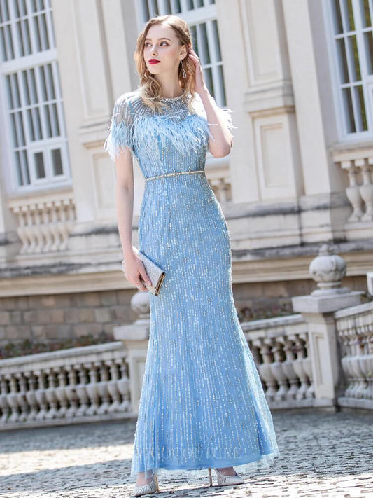 Vestido de fiesta de sirena con lentejuelas azul claro brillante, tirantes finos y espalda de corsé 22229