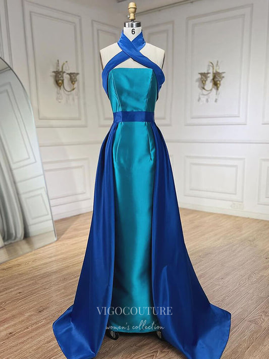 Vestido de fiesta de sirena de satén azul con sobrefalda y cuello halter, vestido formal 24525