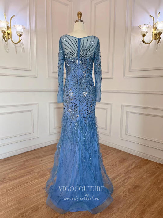 Vestido de fiesta vintage con plumas y cuentas, vestido de noche de manga larga 22125