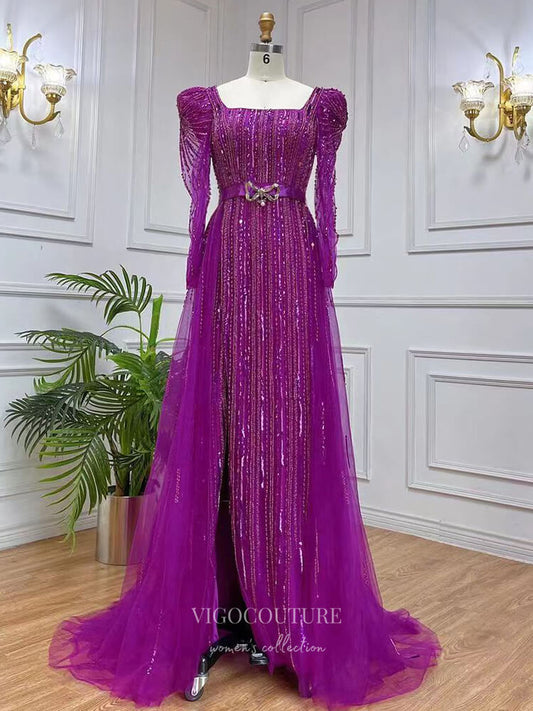 Vestido de fiesta vintage con cuentas, abertura, manga larga, escote cuadrado, vestido de noche 22112