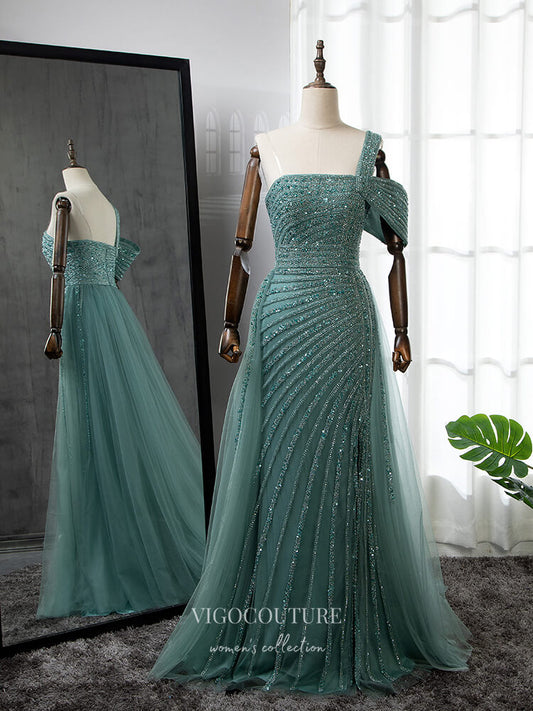 Vestidos de fiesta vintage con cuentas y abertura en el hombro, sobrefalda, vestidos formales 22076