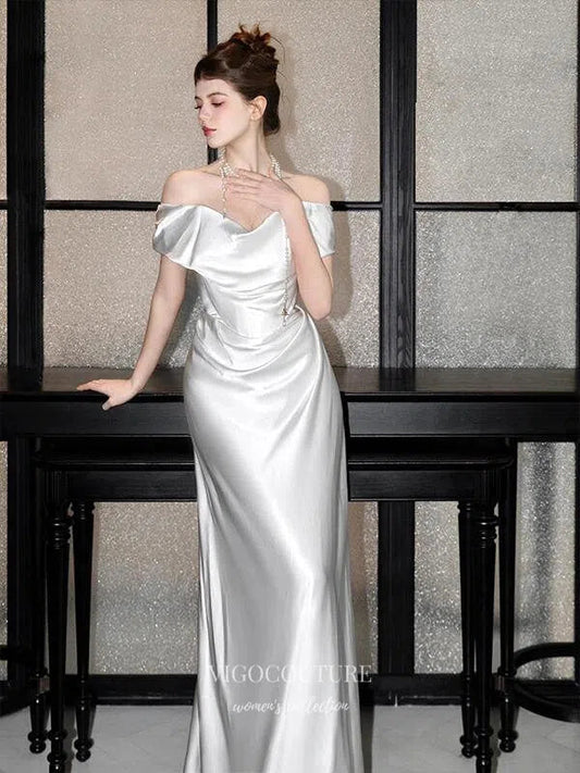 Vestido de fiesta sirena de satén liso color marfil 2025 con hombros descubiertos 25054
