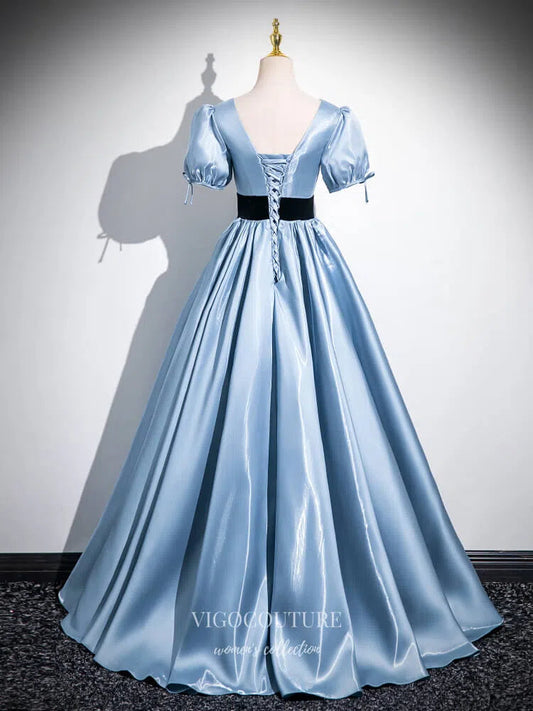 Vestidos de fiesta económicos azul claro con mangas abullonadas 2025, vestido formal de satén con escote en V 25067