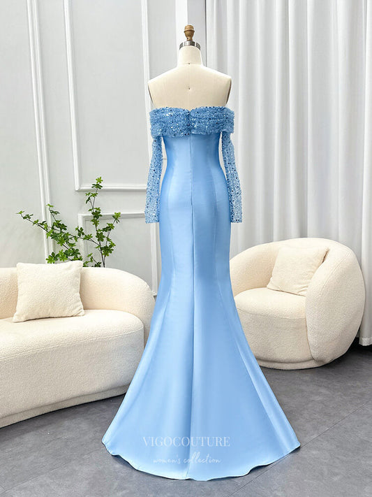Vestido de fiesta de sirena de satén azul claro con hombros descubiertos, cuentas y mangas largas transparentes 24430