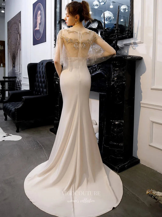 Vestido de fiesta de sirena con cuello alto, mangas cortas y cuentas 20749