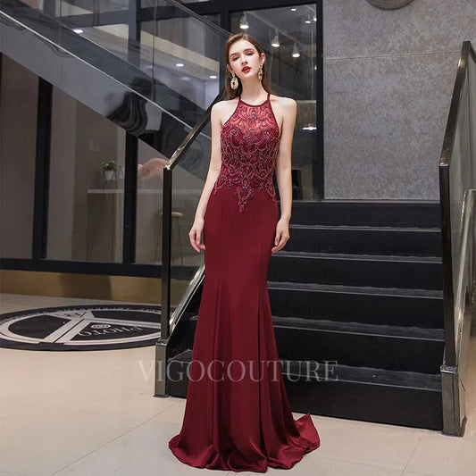 Vestidos de fiesta de sirena con cuello halter y cuentas 20115