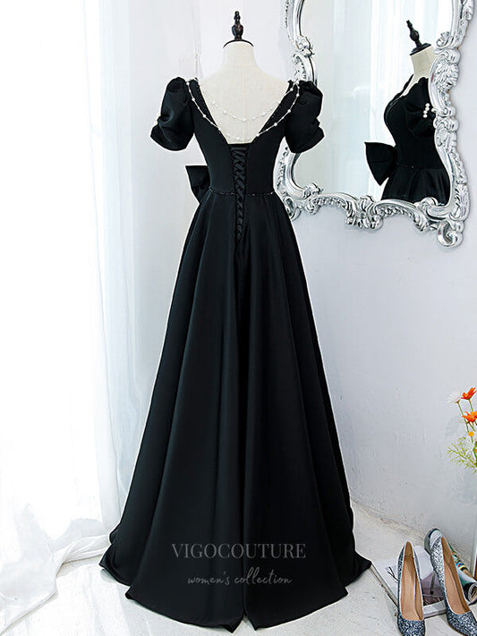 Vestido de fiesta negro de satén con mangas abullonadas y corte A 20884