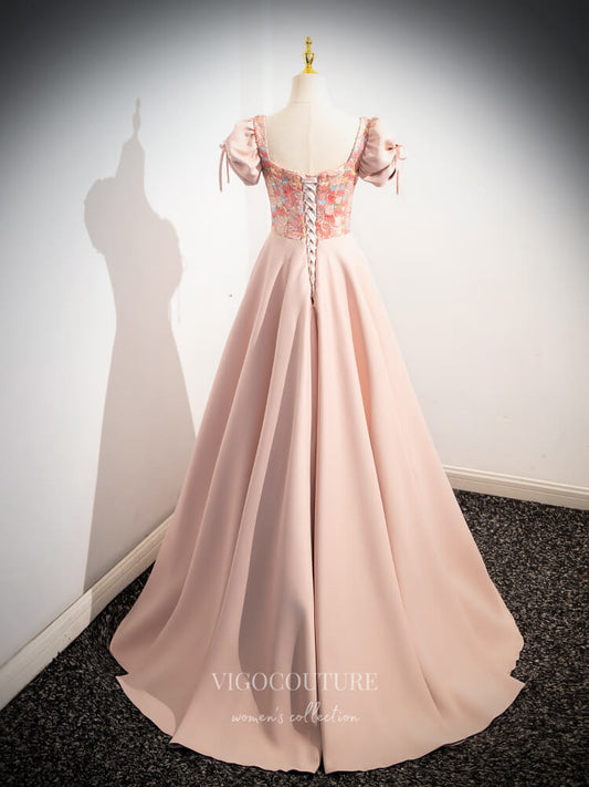 Vestido de fiesta de satén con encaje y lentejuelas rosas, mangas abullonadas y escote cuadrado, vestido formal 24375