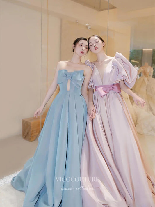 Vestidos de fiesta con lazo de satén y sin tirantes 21029