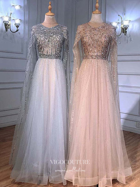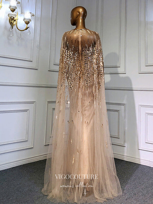 Vestidos formales con mangas estilo capa color champán y cuentas, vestidos de noche 21522
