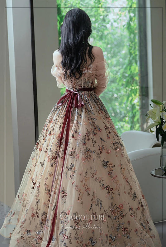 Vestidos de fiesta de encaje con cuentas color champán, hombros descubiertos, manga larga transparente 24379