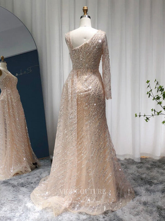 Vestido de fiesta con lentejuelas color champán y sobrefalda de un solo hombro con abertura, vestido de desfile 22155