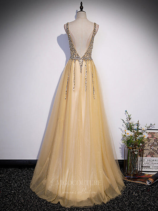 Vestido de fiesta de tul con lentejuelas color champán y escote en V 20889