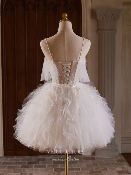 Vestido de fiesta con apliques de encaje color marfil y tirantes finos con volantes hc319