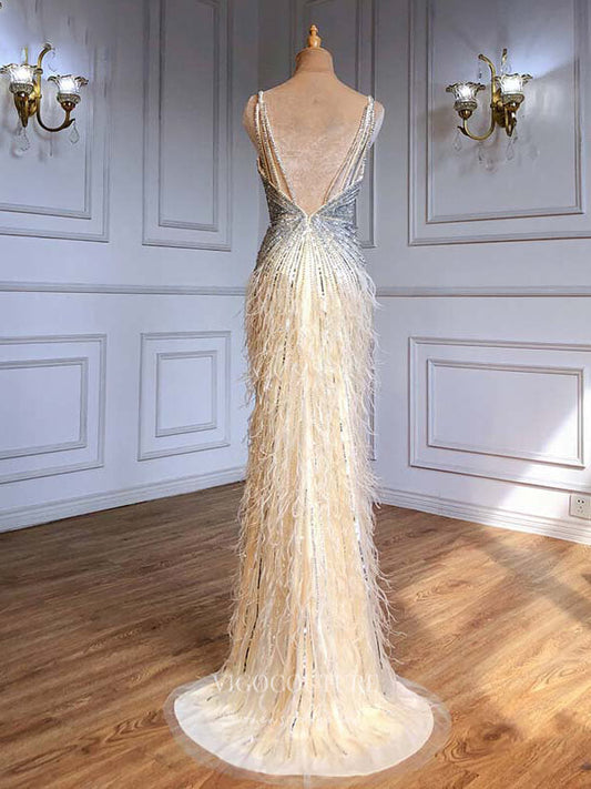 Vestido de noche de sirena con tirantes finos y plumas y cuentas 25027