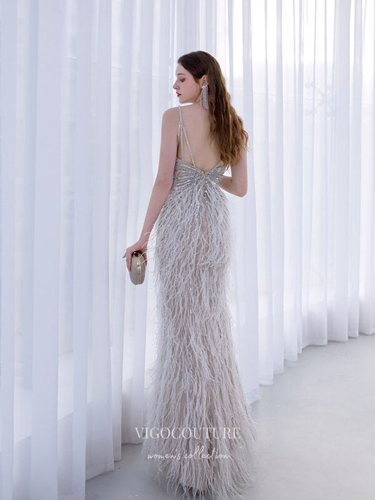 Vestidos de fiesta con plumas plateadas, vestidos formales de sirena 21510