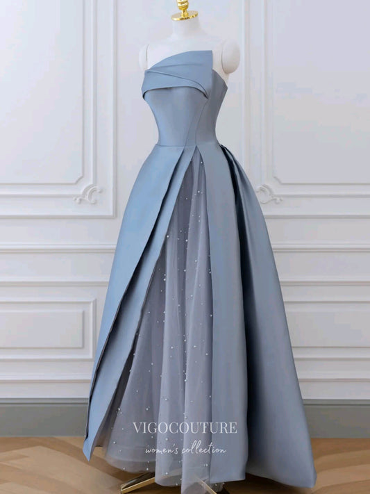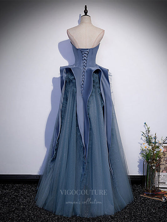 Vestidos de fiesta azules sin tirantes, vestidos formales de satén 21171