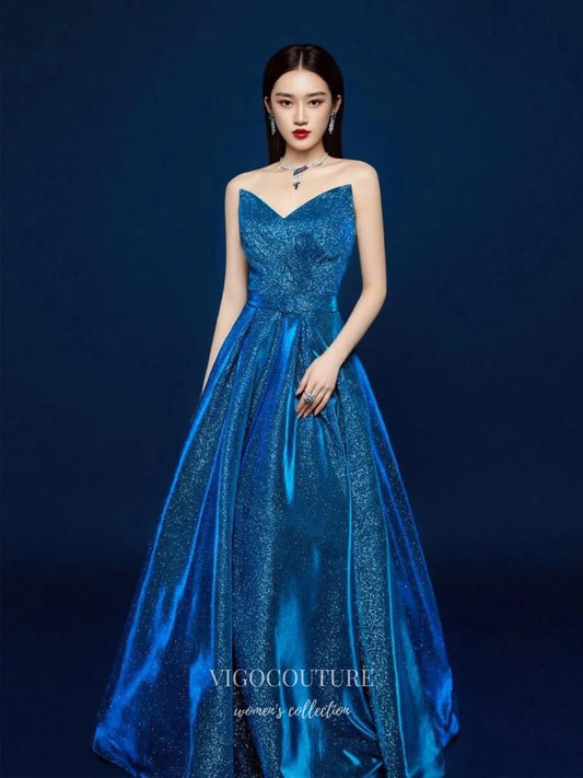 Vestidos de fiesta azules sin tirantes y escote corazón 2025, vestido formal de satén brillante 25059