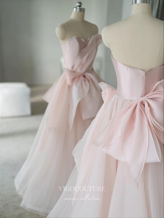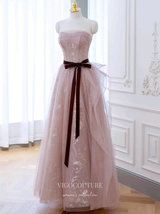 Vestido de fiesta de satén sin tirantes color ruborizado con lazo 22061