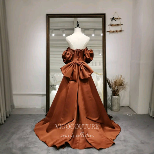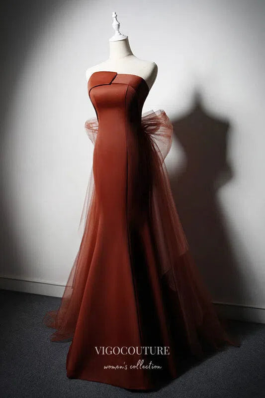 Vestidos de fiesta marrones de corte sirena sin tirantes y con lazo 22376
