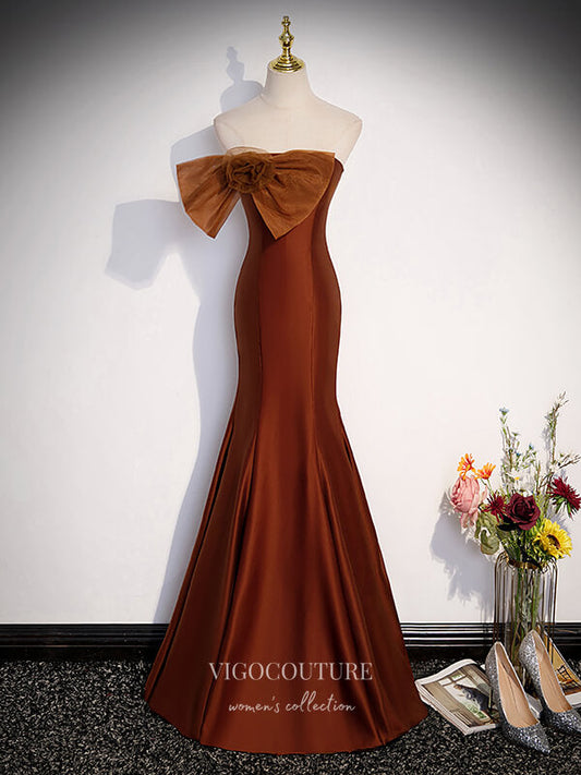Vestido de fiesta sin tirantes con lazo en color marrón y rosa, de satén, corte sirena, 24426