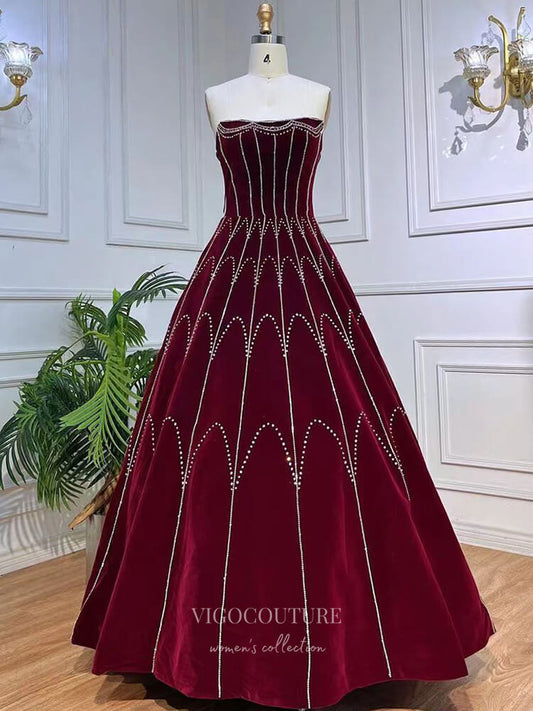 Vestido de fiesta de terciopelo burdeos con cuentas y mangas desmontables 22107