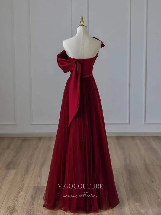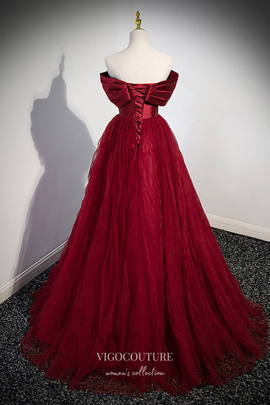 Vestido de fiesta burdeos con hombros descubiertos, vestido de noche de tul de corte A 21780