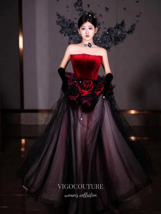Vestidos de fiesta con lazo burdeos, vestidos formales sin tirantes 21024