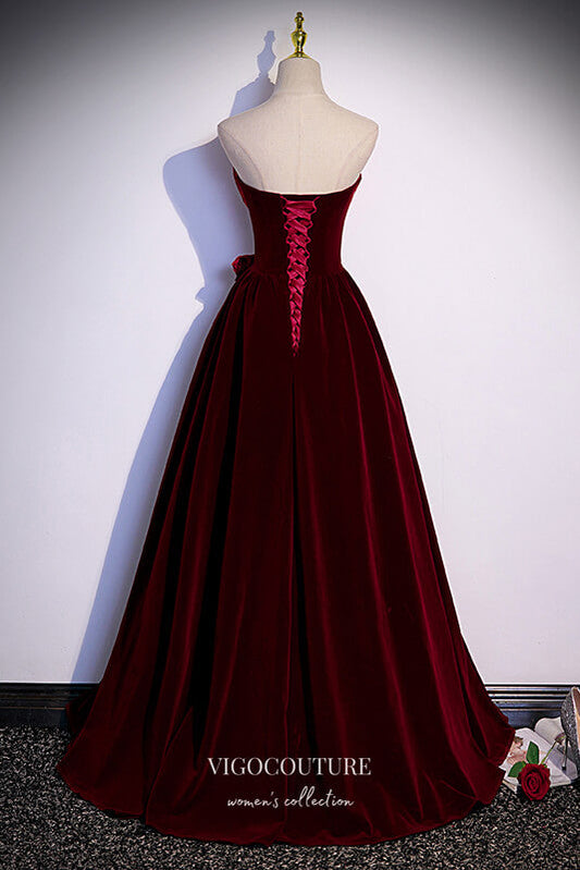 Burgundy Beauty: Vestido de fiesta sin tirantes de satén brillante con prácticos bolsillos hc242