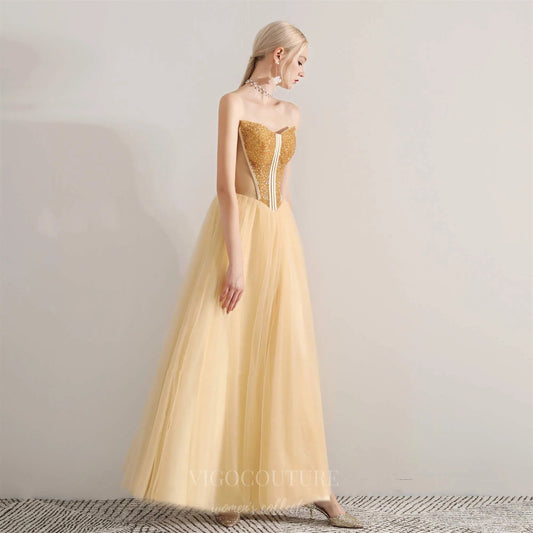 Vestidos de fiesta de tul brillante color champán sin tirantes con apliques de encaje 24116