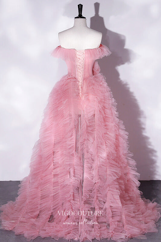 Vestido de fiesta rosa con hombros descubiertos, volantes y abertura alta 22356