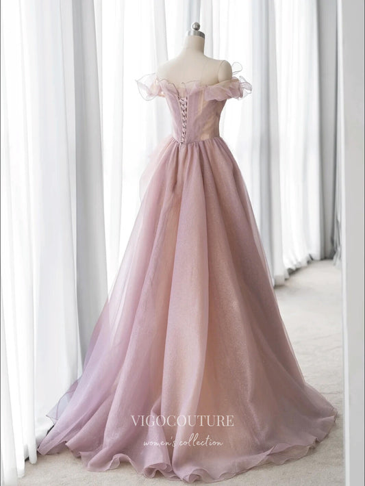 Vestido de fiesta de tul rosa brillante con hombros descubiertos y volantes 22060
