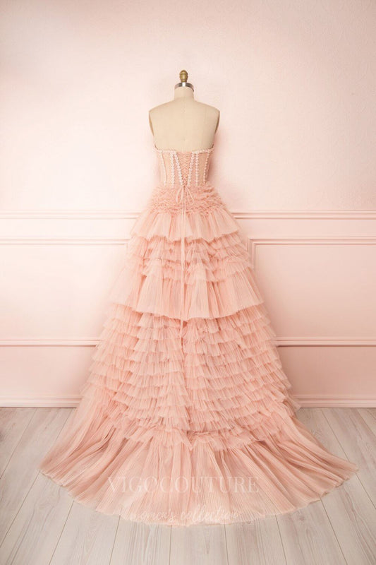 Vestido de fiesta rosa sin tirantes con volantes y apliques de encaje 24037