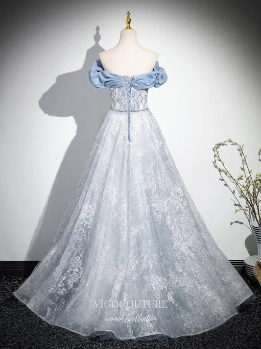 Vestido de fiesta azul brillante de tul con volantes y hombros descubiertos 25077